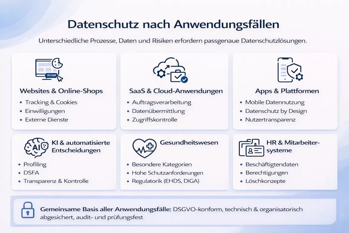 Datenschutz stellt je nach Einsatzbereich sehr unterschiedliche Anforderungen. Prozesse, Datenarten, Risiken und regulatorische Pflichten variieren deutlich. Ein wirksames Datenschutzkonzept berücksichtigt daher immer den konkreten Anwendungsfall und verbindet rechtliche Vorgaben mit technischer und organisatorischer Umsetzung.